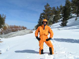 This is me in my "Mango Mountain Man" one=piece suit by Patagonia. Warm and weatherproof... in addition to being the "brightest" guy on the mountain.