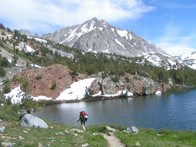 The following morning, we hiked up higher to start the climbing up to Mt. Russell. Here's Christi with Upper Boy Scout Lake on the right.