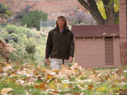 Mike is sporting the new fall '06 outdoorsy clothing line. Jacket -- brand new, $150, but as worn is $5; Pants -- brand new, $80, but as worn is $0 since there are holes already, though he did use duct tape over the holes. Hair -- dirt bag classic, $priceless.