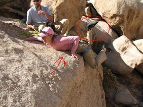 The inventor of the "Dolphin Move" getting ready to use it --- showing us how to perfect the move to roll over the crux. Nice posture, good hand holds, foot smear, and an on-site giggle.
