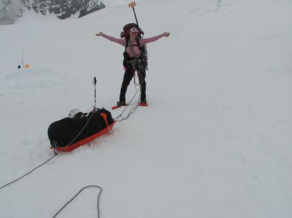 We hiked over the 5-mile crevasse field during a storm with visibility of only a hundred feet or so. It was hard. Two semi-blind people! We could barely see where we were going, and this was over open crevasses. Christi fell in a couple of times. The following day to 9600 ft camp was worse. Worse storm. Unfortunately no footage of that since we were both pretty stressed. However, the day after, to 11,000 ft camp, the weather was awesome. Video of that.