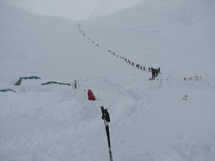 Traffic on Denali! Motorcycle Hill just out of 11,000 ft camp. We could see people going up, and we tried going up; but I just couldn't see to lead, and Christi couldn't either. So we had to return to camp and wait. Just wait.