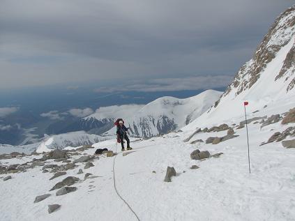 Weather at 17,000 ft High Camp was bad -- high winds, super cold, and low visibility. Christi got frost-nip on one of her toes, so we called it a day and went down. Here we are going down with the views below.