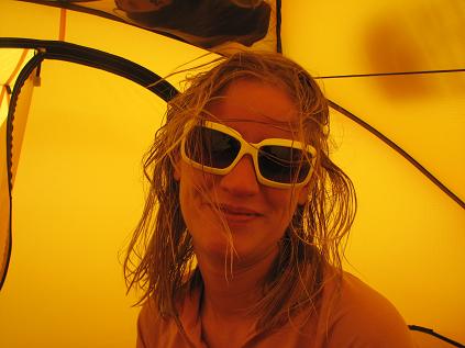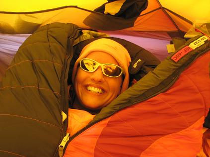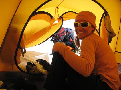 Life at 14,000 ft Camp. Christi's in her -15F down sleeping bag stuffed inside a -40F synthetic life. We were definitely comfortable and toasty.
