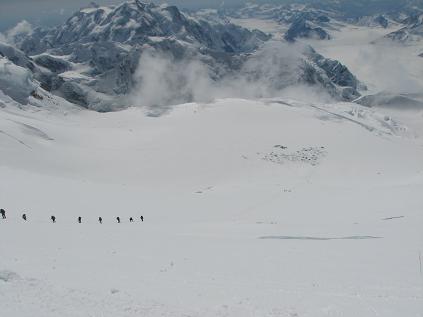 And then we finally got our lazy butts out and started up. We are just about at the West Buttress Headwall some 16,000 ft. Photo is of a guided group behind us and the 14,000 ft Basin Camp below.