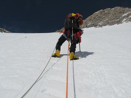 Christi moving up the headwall's fixed lines. Don't want to slip and fall here!