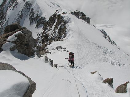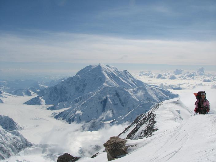 Above the headwall. On the ridge to 17,000 ft high camp. Either side is bad to fall on. Drops of 3,000 ft or more! Here's Christi with Mt. Foraker (some 18k ft) and the Kahiltna Glacier below. That's the glacier we had traversed along to get up to the 14,000 ft Basin Camp.
