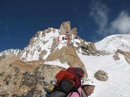 Christi taking a break just before Washburn's Thumb at some 16,500 ft (I don't know, just guessing). In red circle are two climbers.