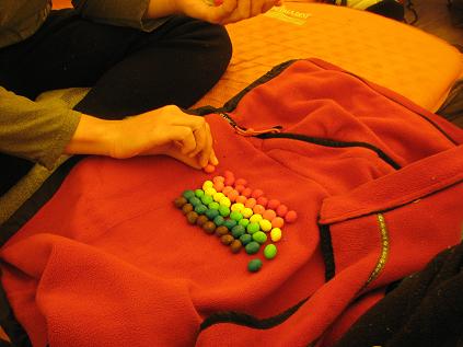 Day 27: 4 days waiting for planes. Was going crazy. Had M&Ms, and so made use of empty time.