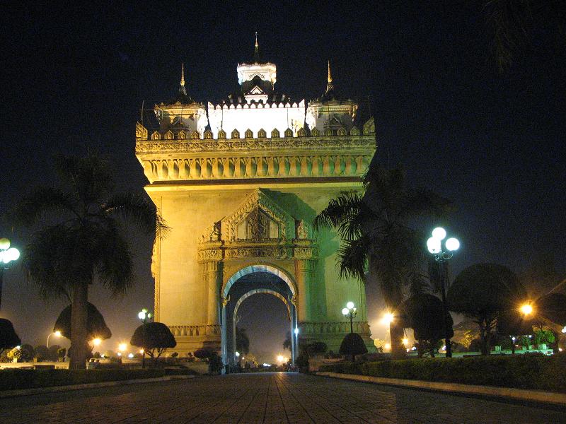 Here is the Pataxai at night, Vientiane's Arc de Triomphe. Built by Laotians, inspired by the French, and made possible by American cement left here from the war back in the '70s.