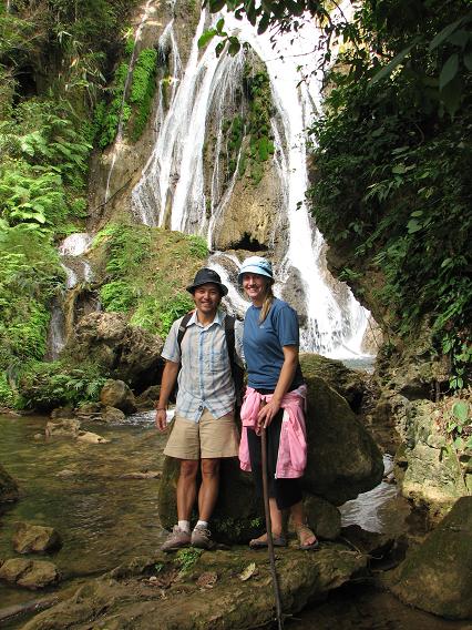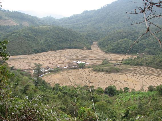 On the trek to the waterfall... view of rice fields below. It's not rice season, so it's brown. But during the rainy season, this is all lush greenery.