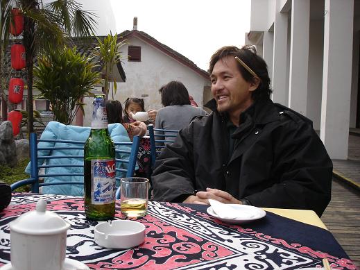 Lunar New Year's Eve - finally warm enough to eat outside! That's REAL hot chocolate Christi's drinking, made with MILK!! (A novelty in Asia!) Ohh, and that's Tauru's beer.