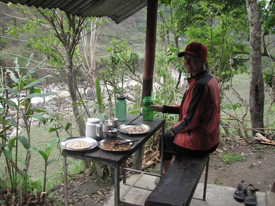 Here is Christi enjoying the first breakfast of the trek - not bad, but the menu is exactly the same at every lodge all around the trek...