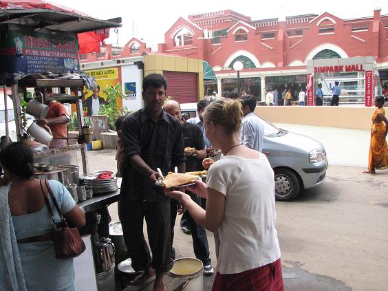 Yum. She stands around some folks chomping on her Masala Dosa -- potatoes, lentils, tomatoes, a lentil soup, and a small bowl of curd. 15 Rupees, so just barely over $0.30.