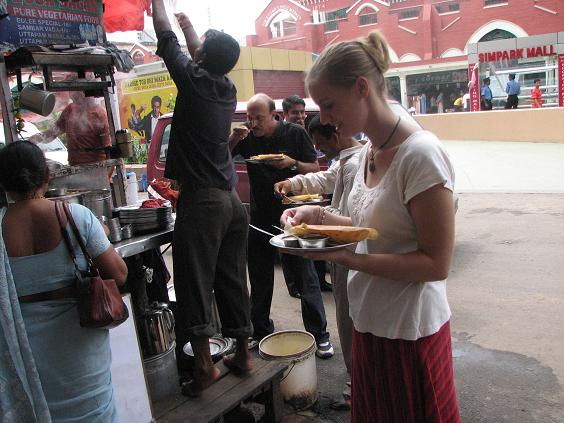 There's Christi ...getting some Paw Bhaji. FYI... 12 Rupees... at 42 Rupees to the dollar ...that comes to just over $0.28 ...for a meal! Christi says, "Yelp, I'll take three of those."