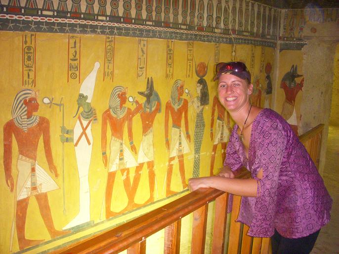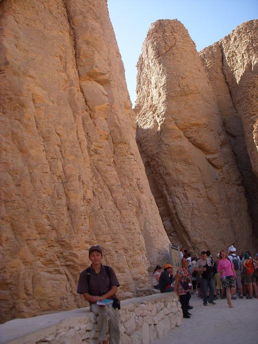Here's Tauru in front of one of the some 20 tombs that have been excavated. People to the right are lining up to go inside for a view of the tombs. Story is that when a pharoah takes the throne, he starts building his tomb. The ceiling is painted in blue with yellow five-point stars while the walls are painted with scenes of the pharoah and lots of heiroglyphics. Each tomb has a sarcophagus, but the mummies of the pharoahs have been removed and are now in the Egypt Museum in Cairo.