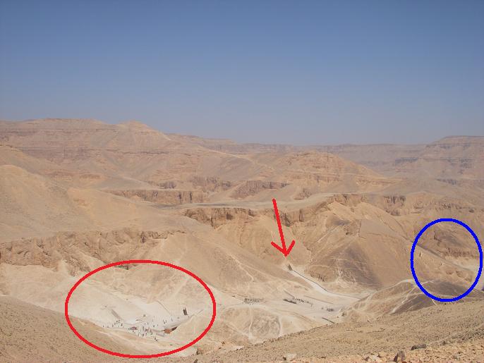 Here's looking back at the Valley of the Kings. Not much -- just a bunch of tombs hidden in the hills. Blue circle is parking lot; Red circle is where King Tut's tomb is; and Red arrow is a tomb.