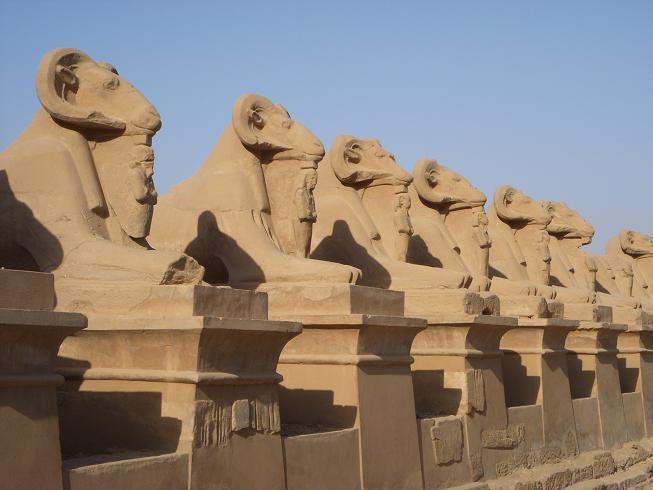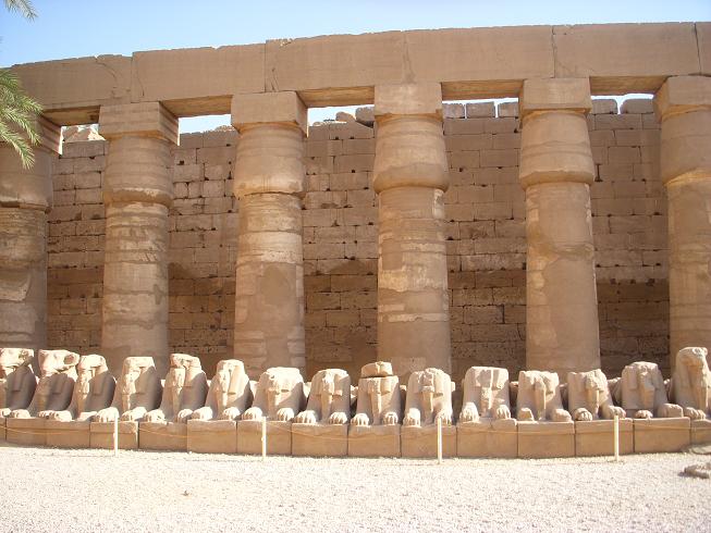 A row of ram-headed sphynxes lines the walk to the temple. Supposedly, these once lead all the way to the Luxor Temple back in the day, about 3km away. Those ruins are still under the ground, under the road!