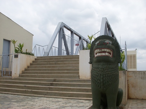 From this angle you can see that pier and the bridge in the background. The Khmer Rouge destroyed this in the 70s, and it wasn't until the 90s when the Japanese rebuilt it that they once again had a way across the river.