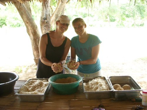 Christi and Loes (the other volunteer (from Holland)) preparing sticky rice for the ladies. The brown powder is a fiber made from rice. It's also a way to put in extra vitamins or medicines.