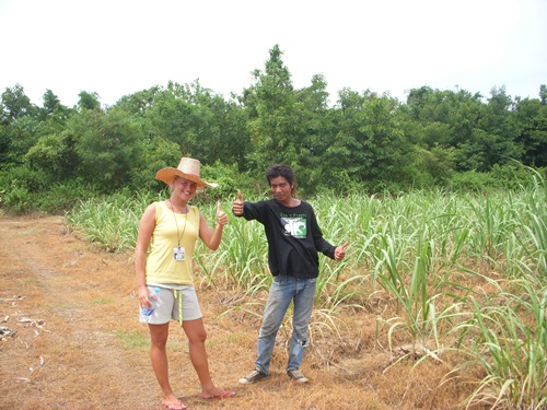 Loes and Kid, another mahout, waiting for a tractor to move a pile of sugarcane.