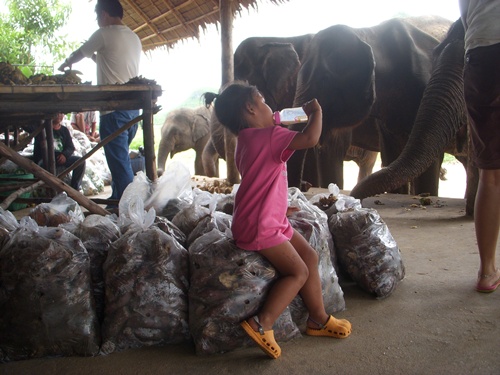 Little girl, be careful. Don't get in the way of these hungry elephants!